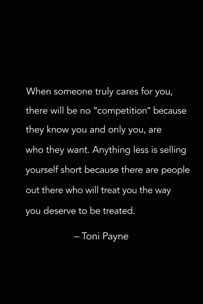 When someone truly cares for you, there will be no “competition” because they know you and only you, are who they want. Anything less is selling yourself short because there are people out there who will treat you the way you deserve to be treated. – Toni Payne Quotes